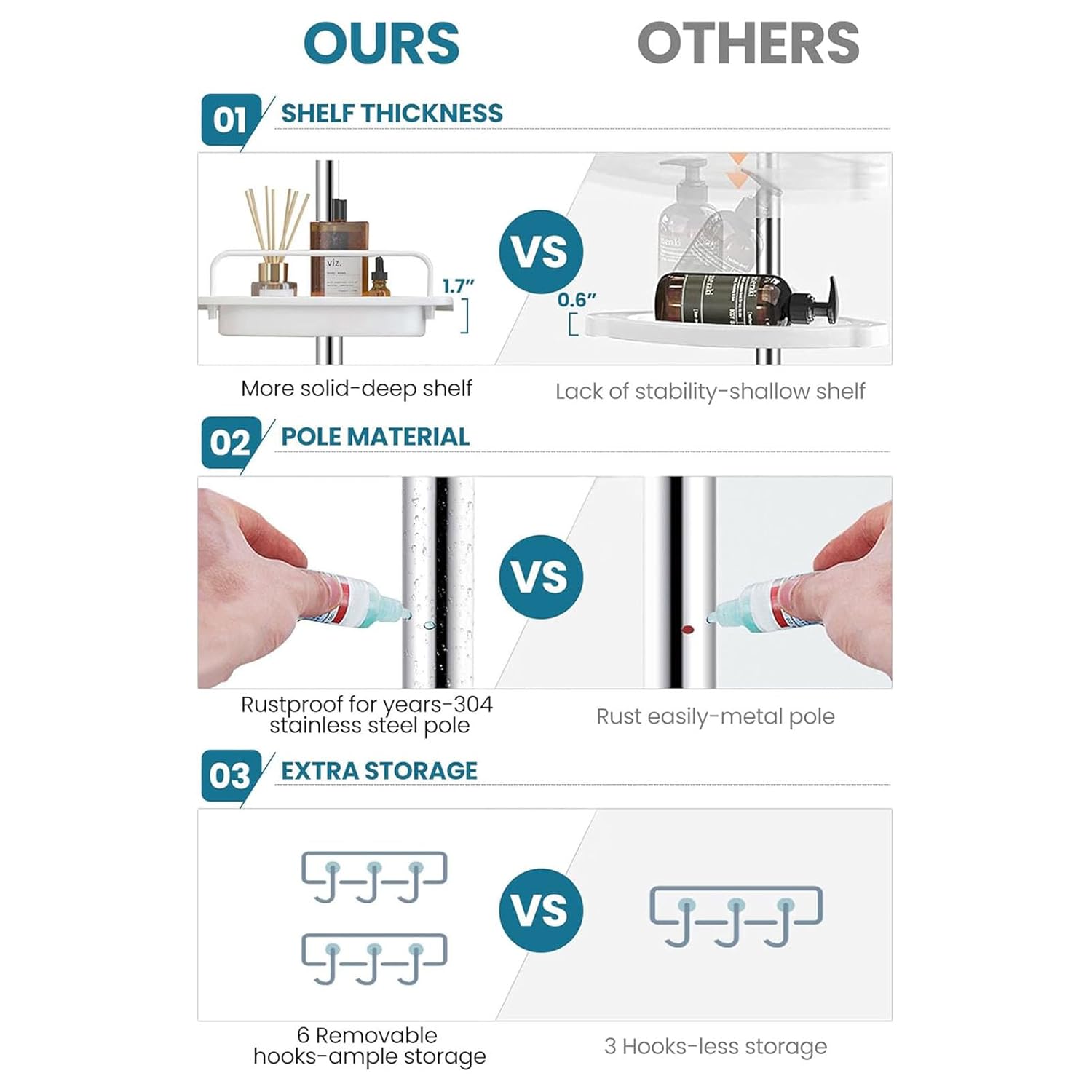 - The newly upgraded tray has been enhanced in thickness and can support turning the shampoo bottle upside down, allowing you to use bath products effortlessly. The thickened tube makes the bathroom shelf more stable