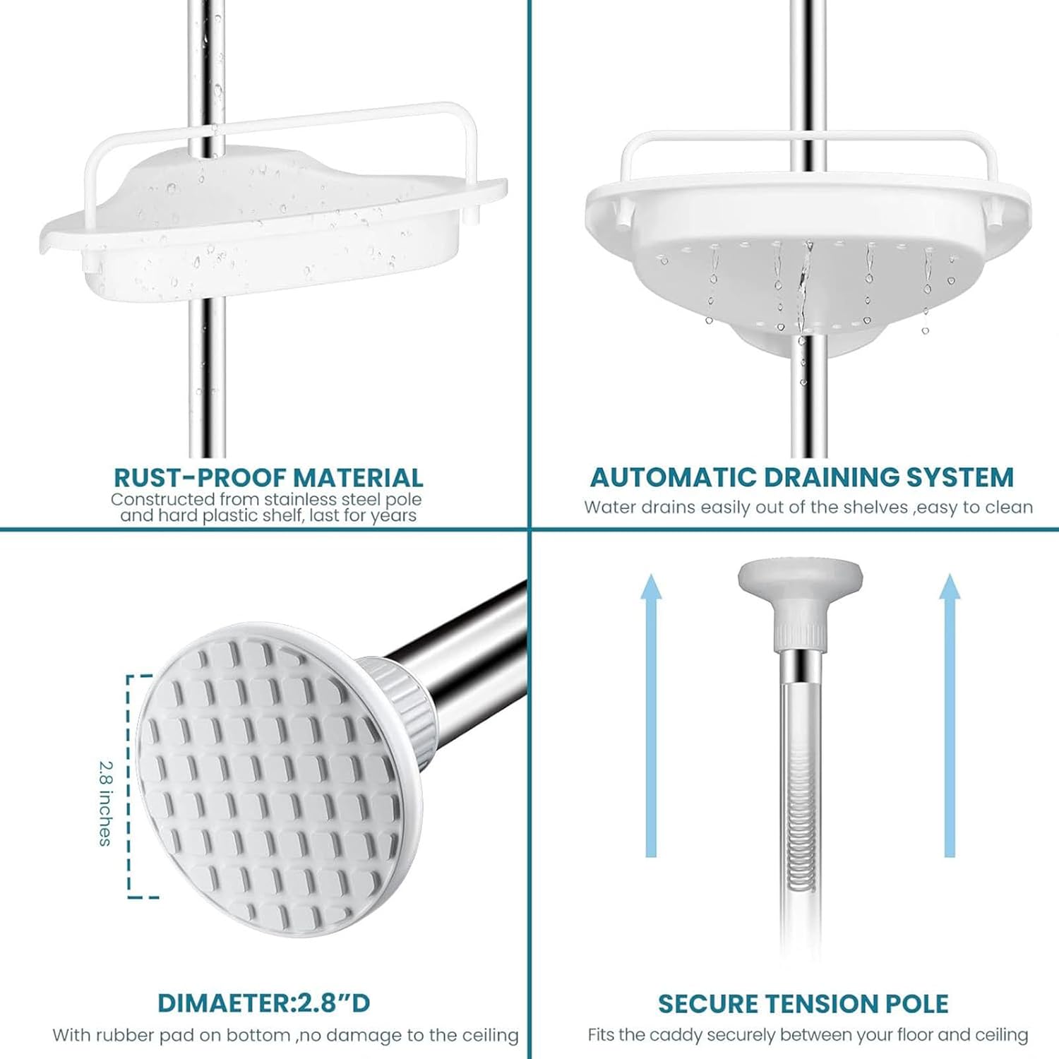 - 【Clean, Safe and Tidy】: The shower caddy contains 2 poles and 4 removable trays with patent drain design that doesn’t accumulate water and bacteria. It makes full use of the space in your bathroom, keeping your bathroom clean and tidy